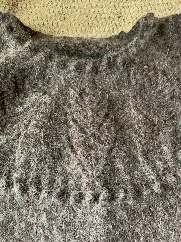 Late add in: years ago I knit this sweater of 90% wool, 10% angora. Tons of work, maybe even 30 years ago. I never sewed up one of the side seams. I’ll do that tonight, then wash and block it. It’s hard to tell with the angora halo and not on the body but the yoke is lace.