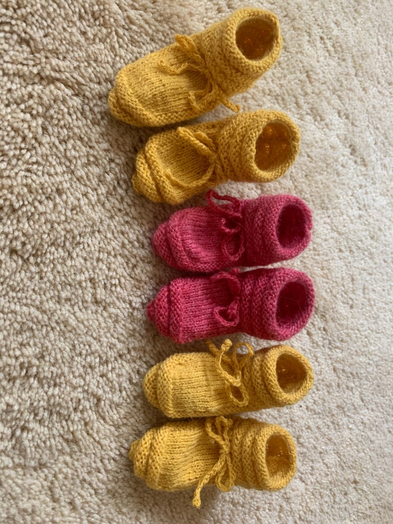 They have yet to be washed and blocked, but these three pair of booties are completed. No more half done booties laying around. I spent hours on these yesterday and today, but it was satisfying work. I changed the pattern on the last one I knit and made it seamless in the round, an improvement on the original.