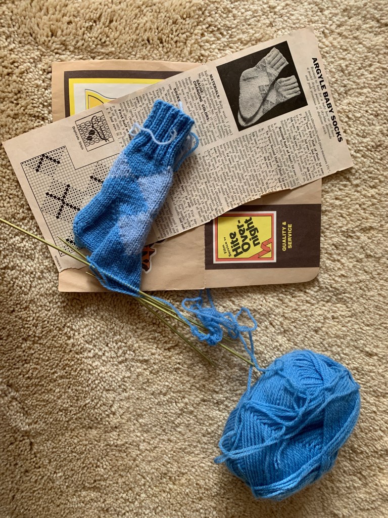 These were not knitted by me but by my friend’s grandmother. They just needed to be seamed. I remember my friend saying that her grandmother struggled with these as she was aging, and I can see that in these socks. I remember my grandmother barely being able to do garter stitch near the end but still knitting comforted and occupied her. I am thinking more about aging and losing abilities in the midst of this pandemic and with my own mother dying. Now is the time for me to try challenging new things that I might not be able to do later. Therefore I am going to make a pair of these socks on my own to practice intarsia which I have done very little of and to try this very interesting construction.