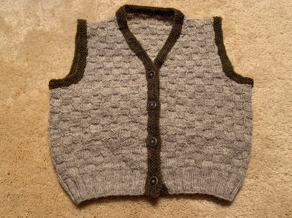 On Saturday I found the beginning of this vest in a Shopko bag upstairs along with a fair sized ball of gray handspun yarn. There was about 1 1/2” done. I should have been finishing off a couple other projects but those involved sewing, and my nervous system needed to knit, something simple that would make the most of this yarn. No pattern but I followed the proportions for a child’s vest in Ann Budd’s useful book, The Knitter’s Handy Book of Patterns. Of course I didn’t know for sure that I would have enough yarn to complete the vest, so I was thinking of alternate plans of color blocking the upper fronts if I ran out. I had just this much left over: