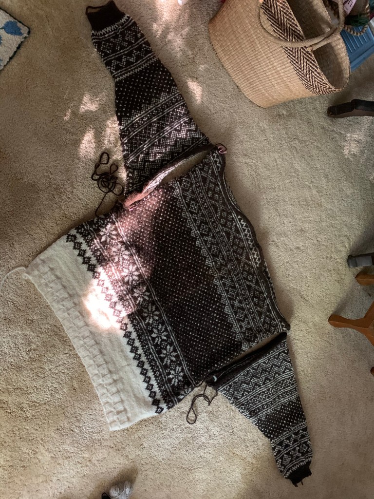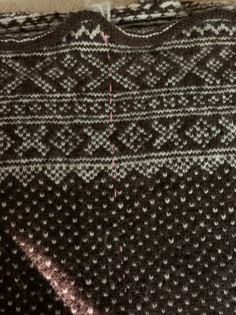 I know why I stopped working on this one. It’s because of the steeks. This sweater was knit as a tube, and the armholes need to be cut into it. The directions to do this are rather skimpy, so I know I was unsure what to do. I think I can handle it now since I recently finished a sweater with a steek, so here goes.